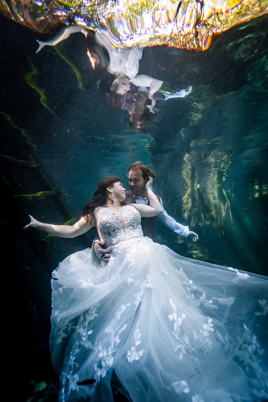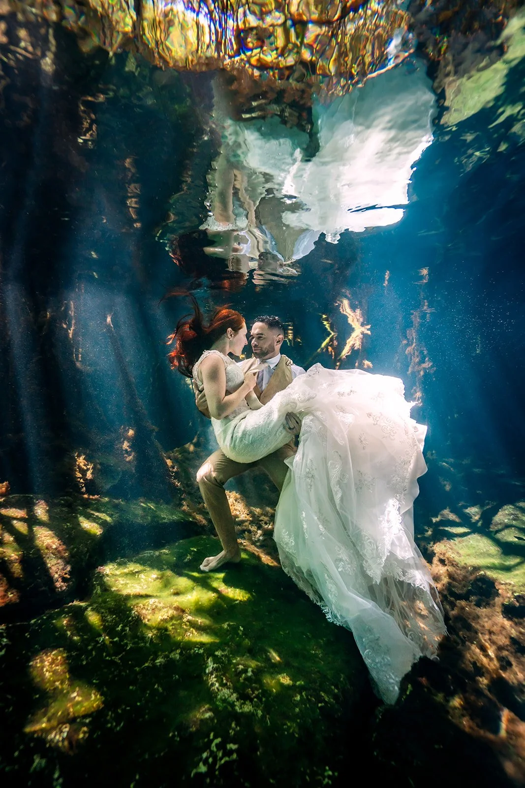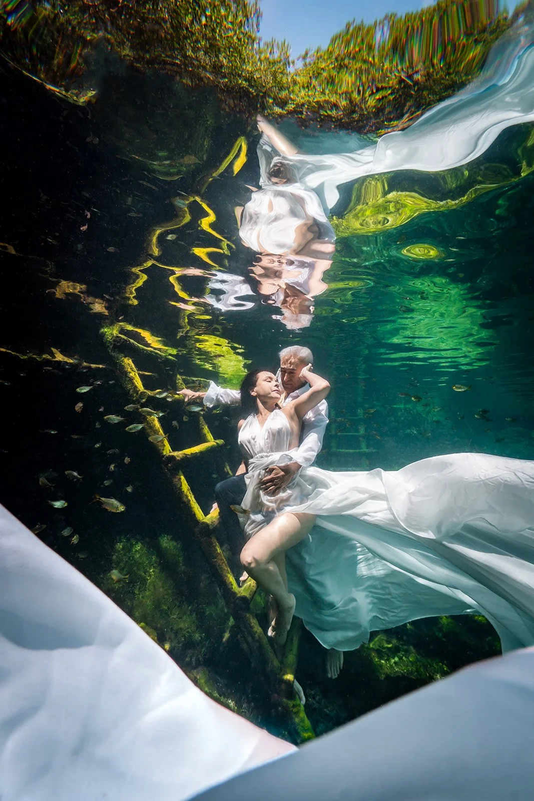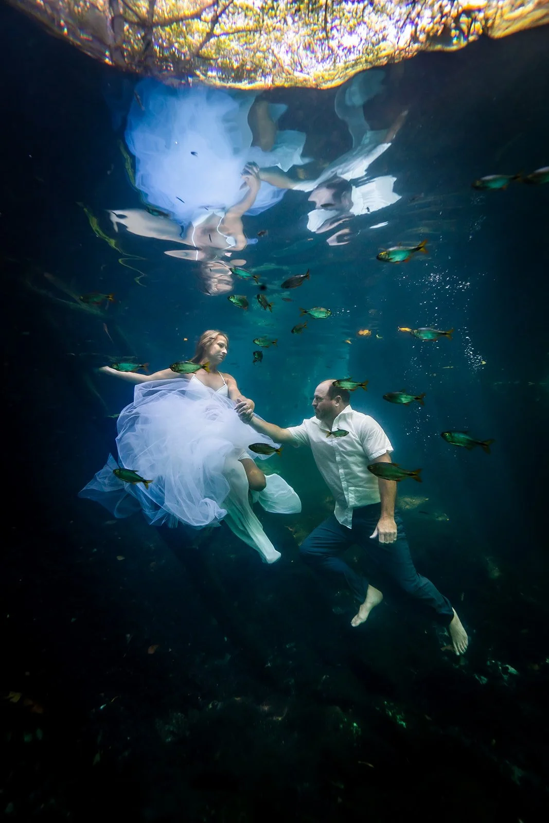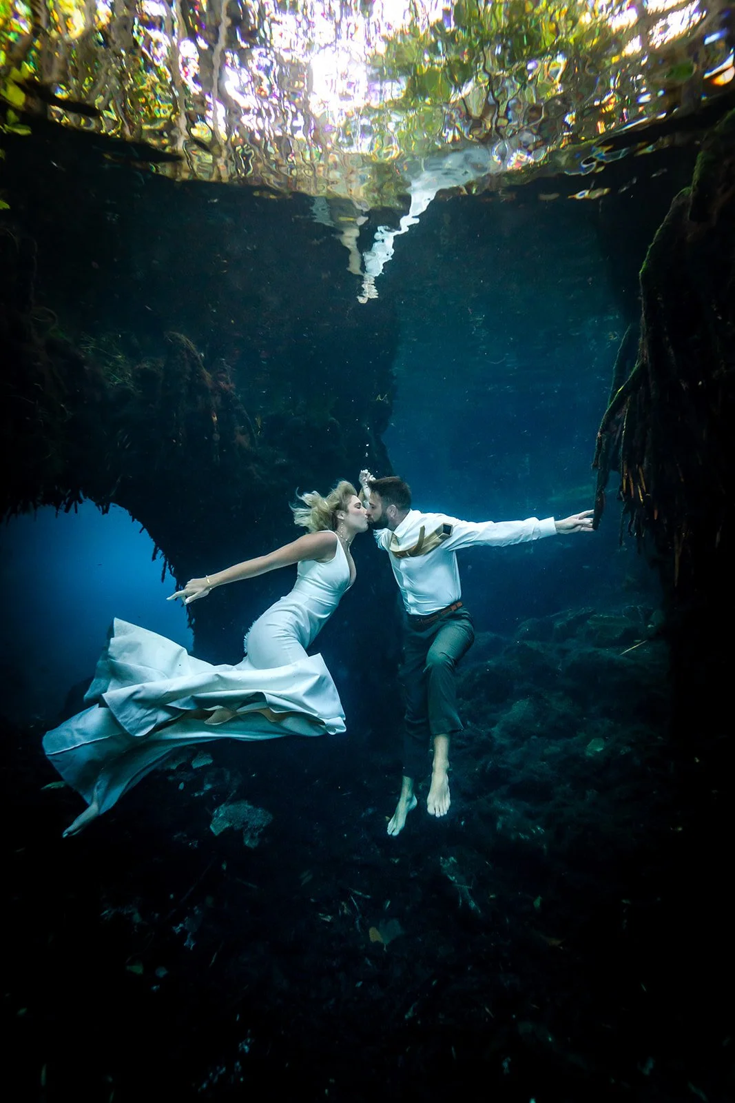 An underwater Trash the Dress photoshoot is one of the most extraordinary ways to celebrate your wedding memories. Why wear your wedding dress only once when you can give it a second, unforgettable life beneath the surface of a crystal-clear cenote?
